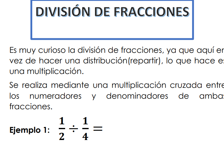 Material Explicativo de División de Fracciones para niños de 4to de Primaria, adjunto actividades practicas.